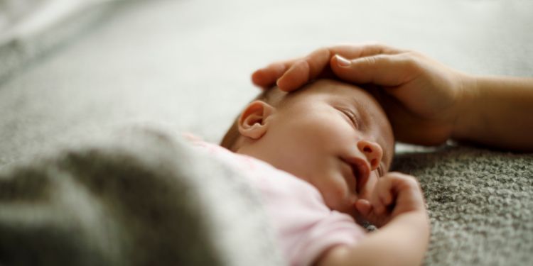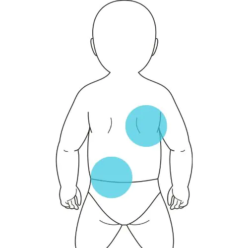 Eine Hand ganz sanft mittig auf den Bauch legen, die andere parallel dazu an den Rücken; es ist dabei nicht entscheidend, welche Hand oben und welche unten liegt; im Zweifel ausprobieren, was dem Baby besser gefällt oder sich harmonischer anfühlt